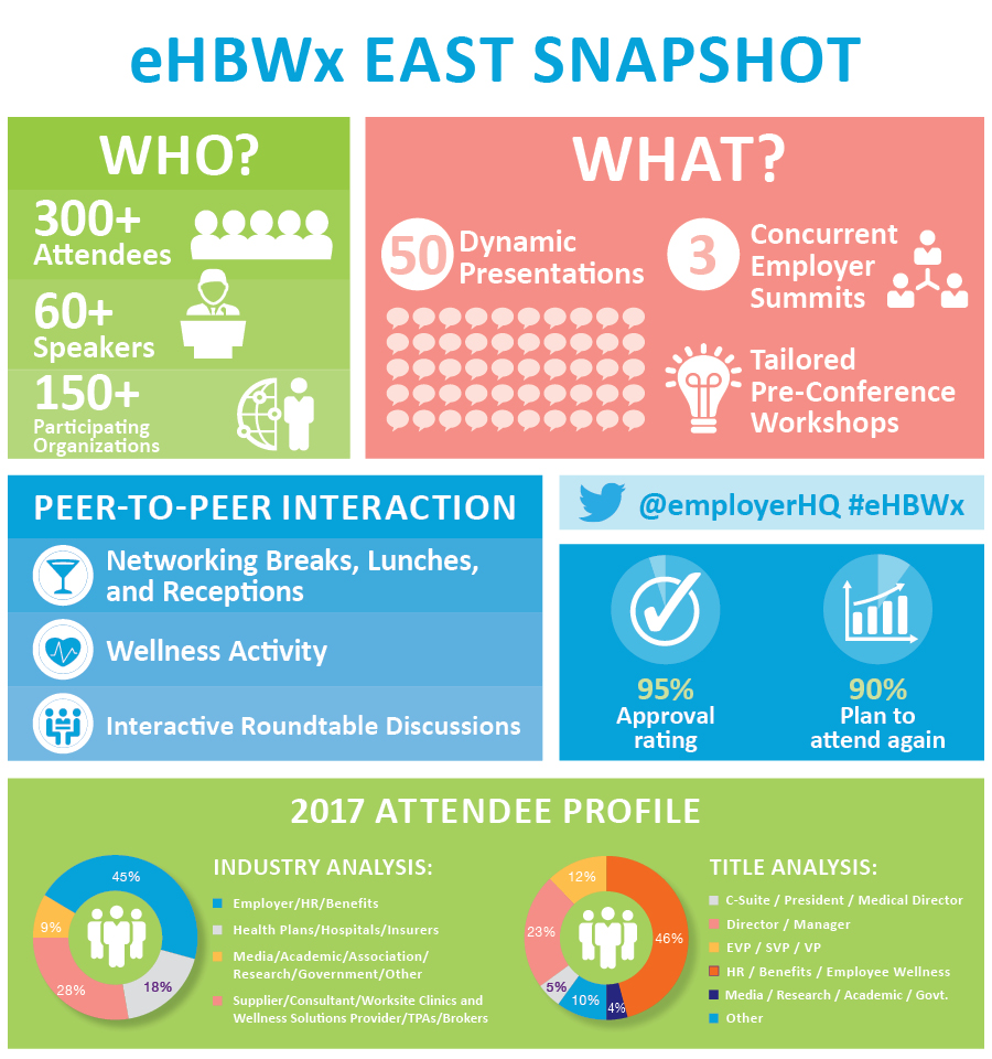 Employers, TPAs, Brokers, Payers, & Providers are moving the needle on employee health care. The Employee Health, Benefits, & Well-Being Congress + Expo East brings together a sophisticated group of HR, benefits, and wellness executives from private and public sector health care organizations to learn and discuss strategies to enhance employee health and improve outcomes while reducing costs.