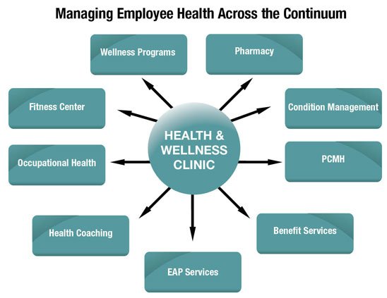- Transform medical clinics into a “storefront” for integrated employee health and wellness